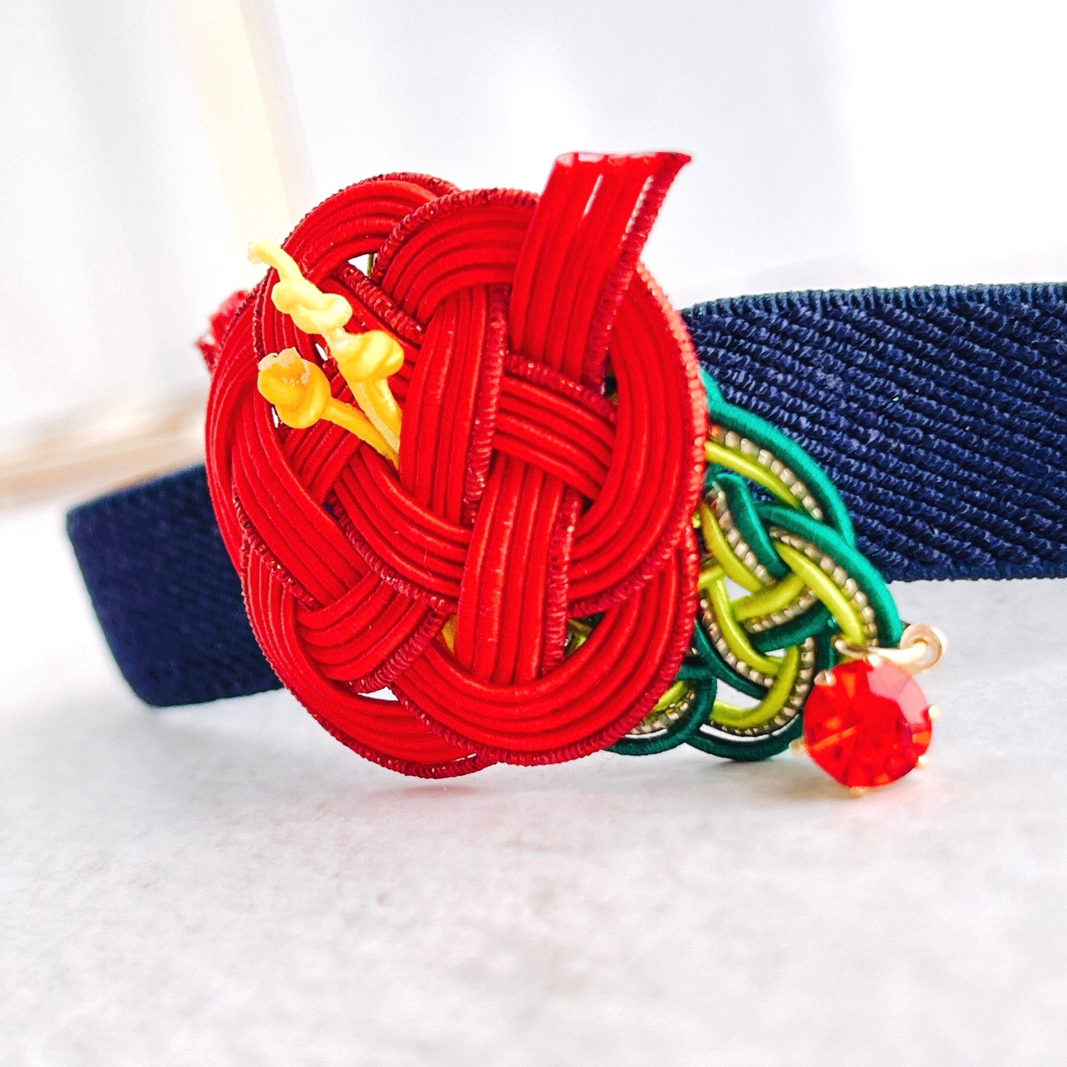 水引、平ゴム(紺)、ポリカーボネート、丸カン、ビジュー