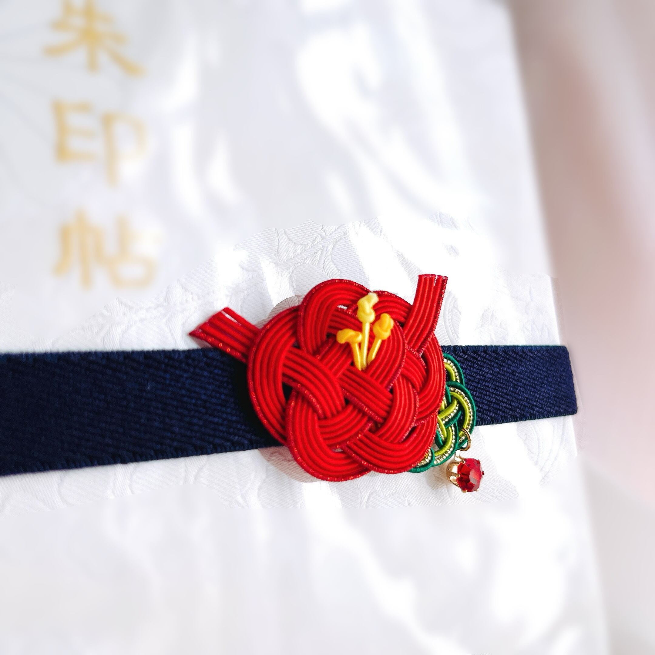 約3×4.5cmの水引で作られた椿のモチーフが、御朱印帳をパッと華やかにしてくれます。